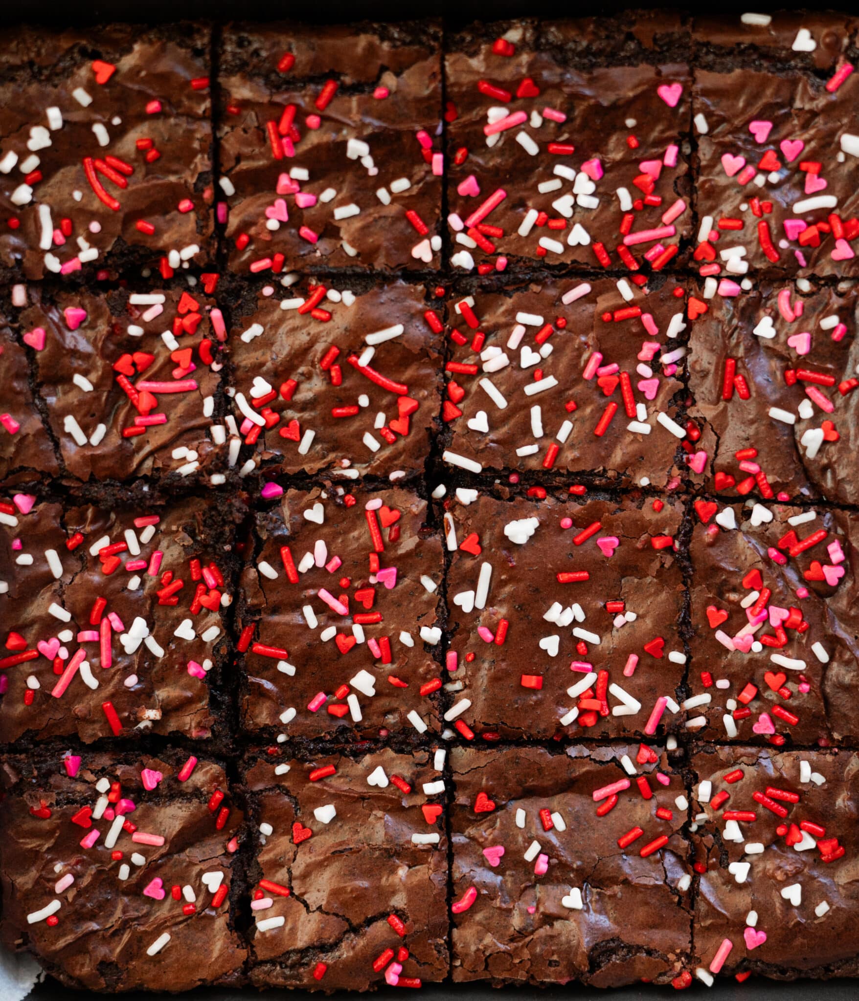 These Valentine’s Day brownies are the perfect treat for your loved ones! The brownie batter is my tried-and-true brownie recipe, which is then topped with a generous amount of Valentine’s sprinkles. They’re simple to make and so delicious!